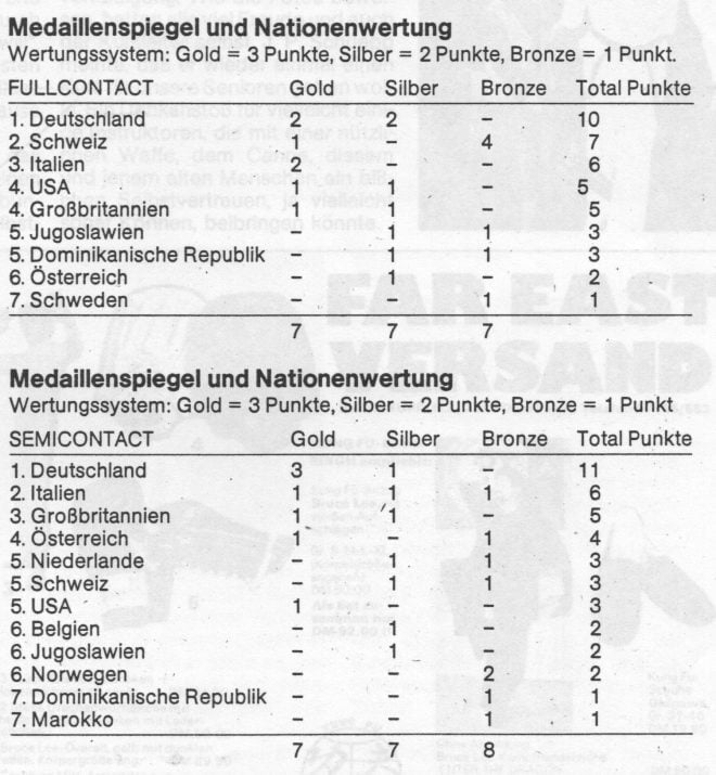 Während die Fullcontactkämpfe nicht nur die Hauptattraktionen des Turniers waren, auch die Schieds- und Punktrichter haben eine wesentlich bessere Beurteilungsgrundlage, so daß es durchweg zu unbeanstandeten Urteilen kam, so ist das Leichtkontakt doch ein gewisses Sorgenkind. Unnötige Härte, zweifelhafte Entscheidungen, dauernde Reklamationen und Proteste haben diesen Turnierteil zu einer Schwerarbeit gemacht. Jedoch darf man sagen, daß diese Erfahrungen zu einer Umstellung im Leichtkontakt führen werden, die diese Disziplin zu einem anderen Beurteilungsmodus führen wird. Ein Vorschlag aus den USA wird ausprobiert und überprüft und sicher bald zu einer wesentlich verbesserten Situation führen. Geert Lemmens aus Hamburg, der als Bundestrainer für Leichtkontakt mit unermüdlichem Einsatz für die WAKO und in der Betreuung und Schulung des Nationalkaders erstklassige Arbeit leistet, gebührt ein großes Lob. Die teils recht widerspenstigen Charaktere der Leichtkontaktier, waren nicht leicht unter einen Hut zu bringen. In dieser Beziehung hatte es Hans Harbrecht aus Darmstadt, der Bundestrainer für Vollkontakt, erfreulich leicht. Unsere Vollkontaktler sind eine absolut beispielhafte Truppe von fröhlich ausgelassenen, bedingungslos hart trainierenden und bescheidenen Sportlern, von denen manch einer noch eine Menge lernen kann. Beide Trainer haben das Ziel unserer Vorstellungen echt übertroffen. Wer in Deutschland unter ihrer Leitung mitgeschult werden will und kann, dem steht der Weg zur Weltspitze offen. Zu einem echten Weltschiedsrichter hat sich Gustav Baaden vom Karate Institut Köln entwickelt. Seine Souveränität und sein Einsatz waren Sonderklasse. Auch er zählt ja von Anfang an zum Kern der WAKO, dem ein großer Teil der Anfangsarbeit in unserem Land und der Region West, besonders aber in Nordrhein-Westfalen zu verdanken ist. Waren im letzten Jahr die meisten Vollkontaktkämpfer aus Berlin, so sind es in diesem Jahr die Sportfreunde der Schulen Jürgen Mandt in Mannheim, Neustadt und Ludwigshafen. Somit ist ein Dank an Herrn Mandt, der seinen Sportlern diese Chance und Erfolge auch mit finanzieller Unterstützung ermöglicht hat, an dieser Stelle angebracht. Über die nächste WM, die nach einem Kongreßbeschluß nur noch alle 2 Jahre ausgetragen wird, ist noch keine Entscheidung gefallen. Beworben haben sich für die Ausrichtung Trinidad, San Domingo, Italien und Holland.