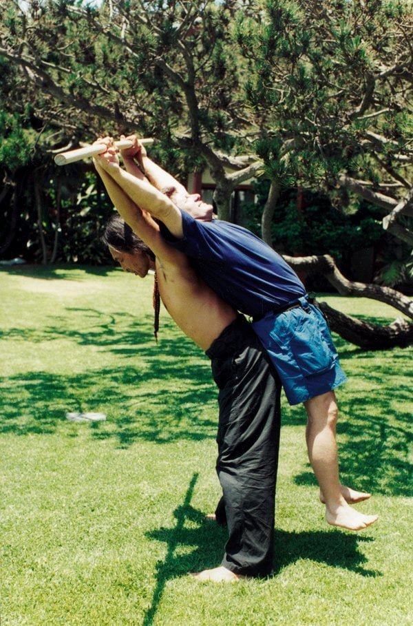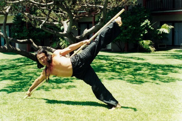 Mit einem 3 Meter Stock übt Tagawa sein Chun-Shin System. Der Stock dient als dritter Balance Punkt um die Energie des Körpers (Chi) besser zu kontrollieren.